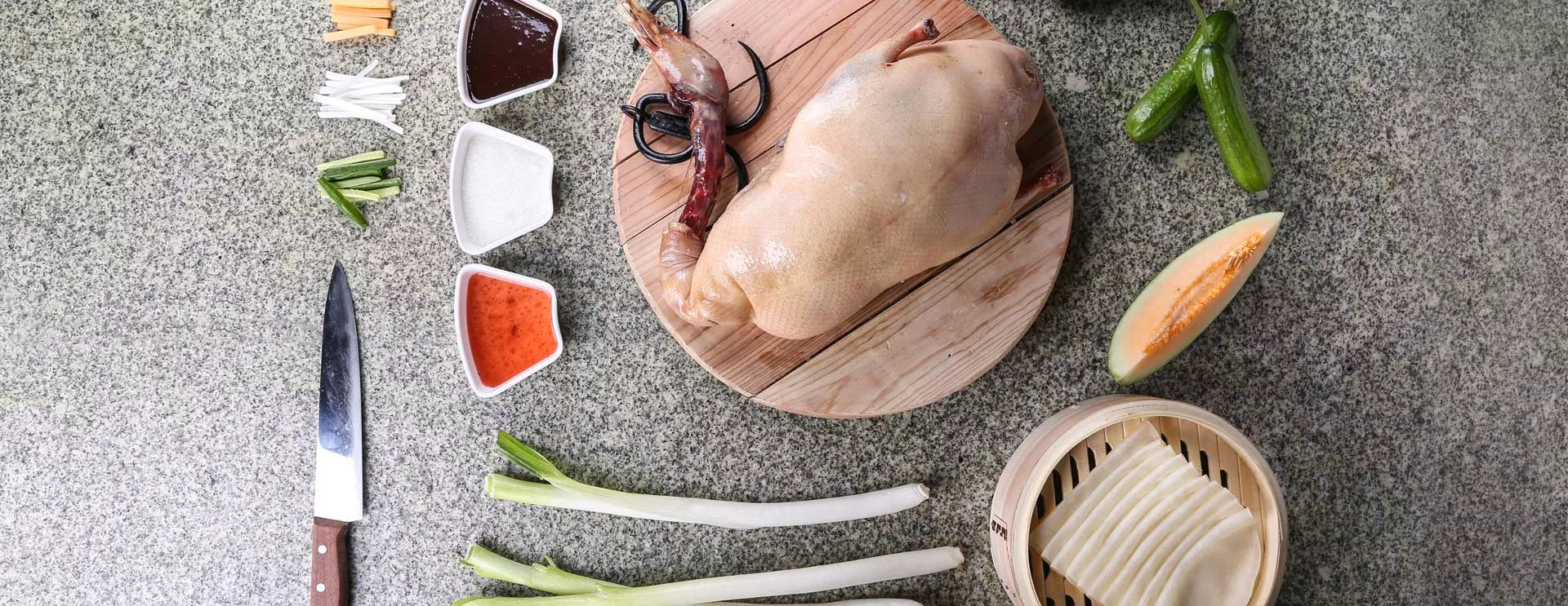 二、采用挂炉形式入堂以墙壁导热原理,放入枣木、桃木在长达49分钟烤制时间将其油脂完全烤化。出炉,去皮片肉,总计108刀成盘,辅以面酱、瓜条等即可食用。